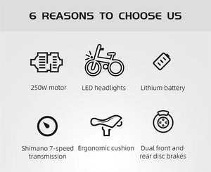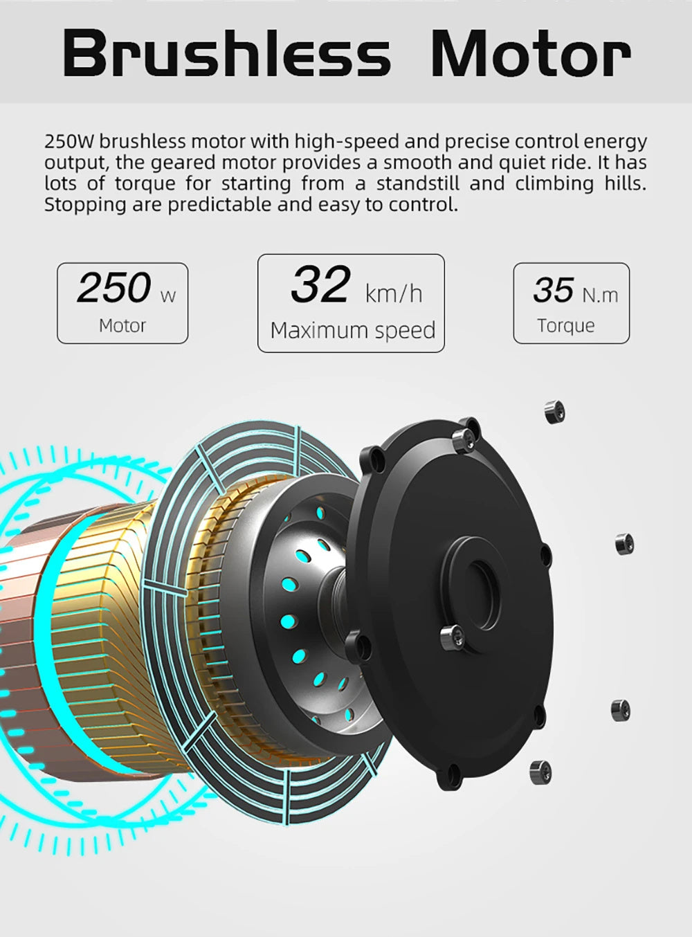 - 250 W borstlös motor (36 V): effektiv och tyst – perfekt för stadspendling.