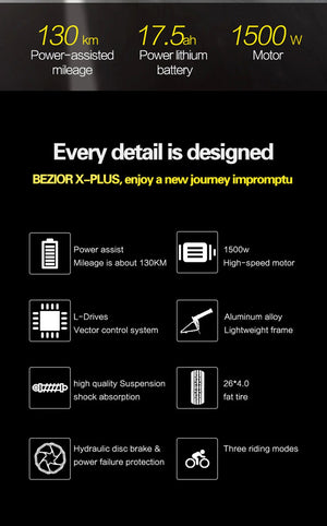 BEZIOR X Plus är elcykeln för dig som vill ha extrem prestanda – 1500 W motor, 48 V / 17,5 Ah batteri och **upp till ca 130 km** med assistans. Med breda 26×4,0″-däck och solid ram står den emot både asfalt och terräng. Fri frakt – alltid.