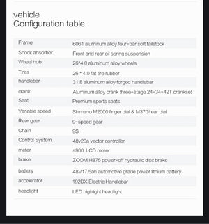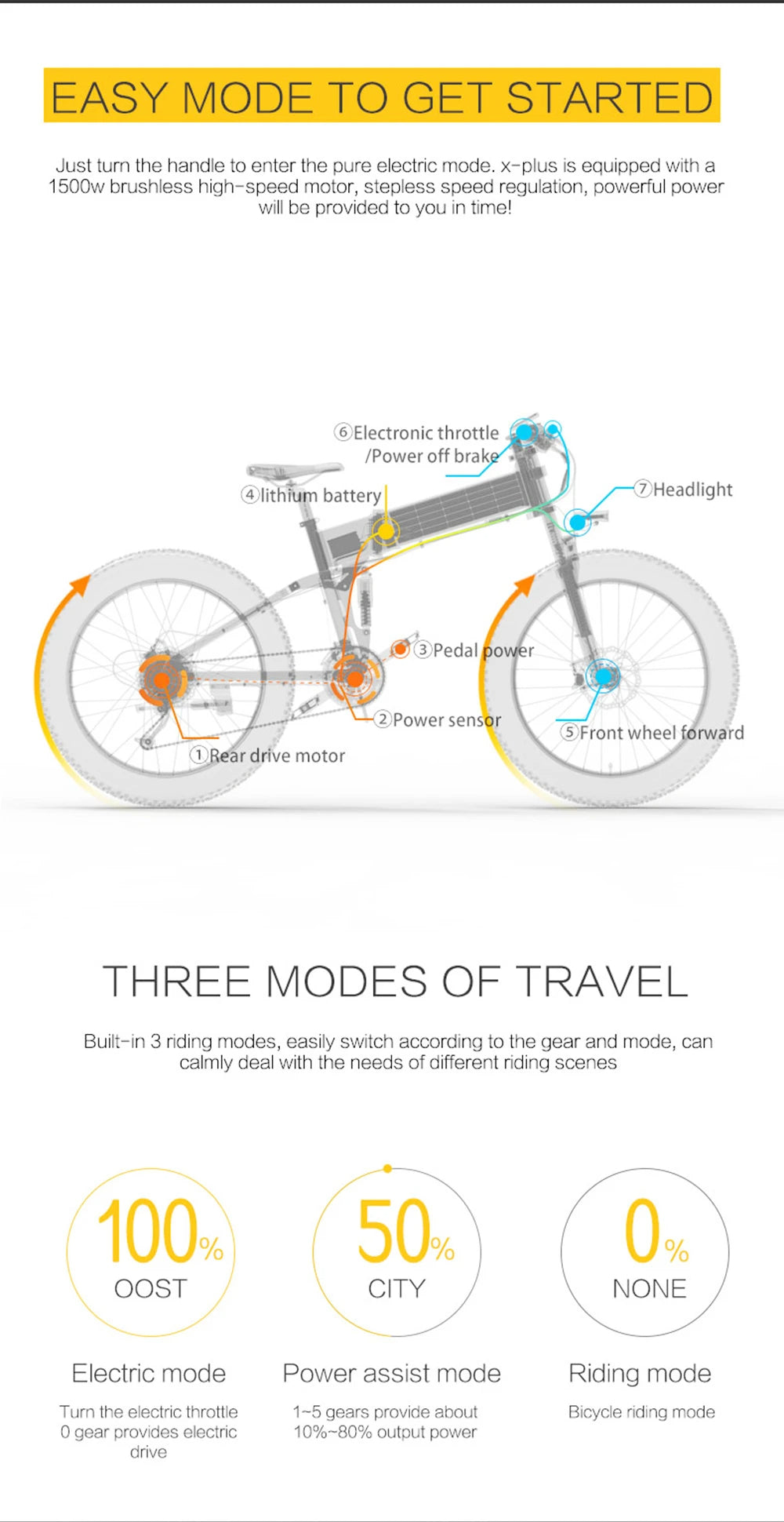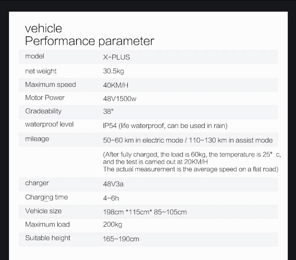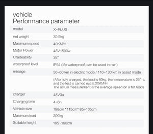 - Motor: 1500 W peak (48 V)