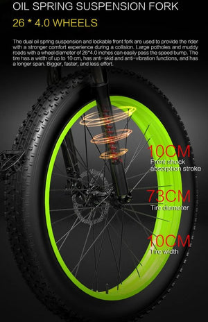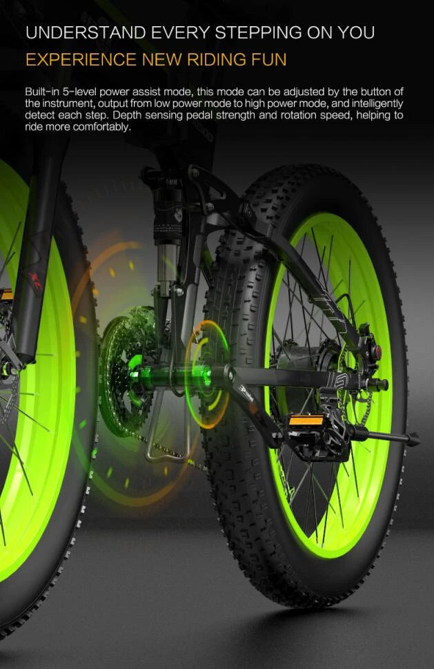 - 26×4,0” fatdäck: massivt grepp och komfort på snö, grus, sand och våt asfalt.