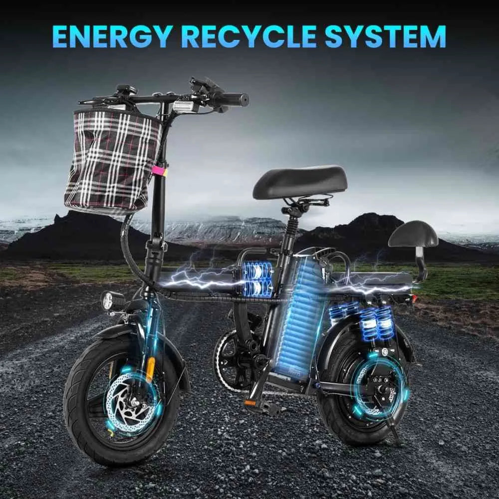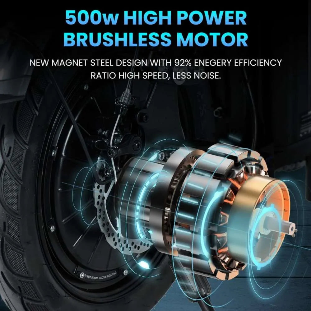 - 500 W motor (48 V): tillräcklig kraft för stadskörning och lättare backar.
