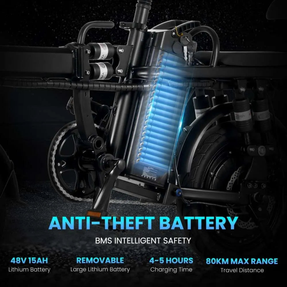 - Batteri: 48 V / 15 Ah, löstagbart