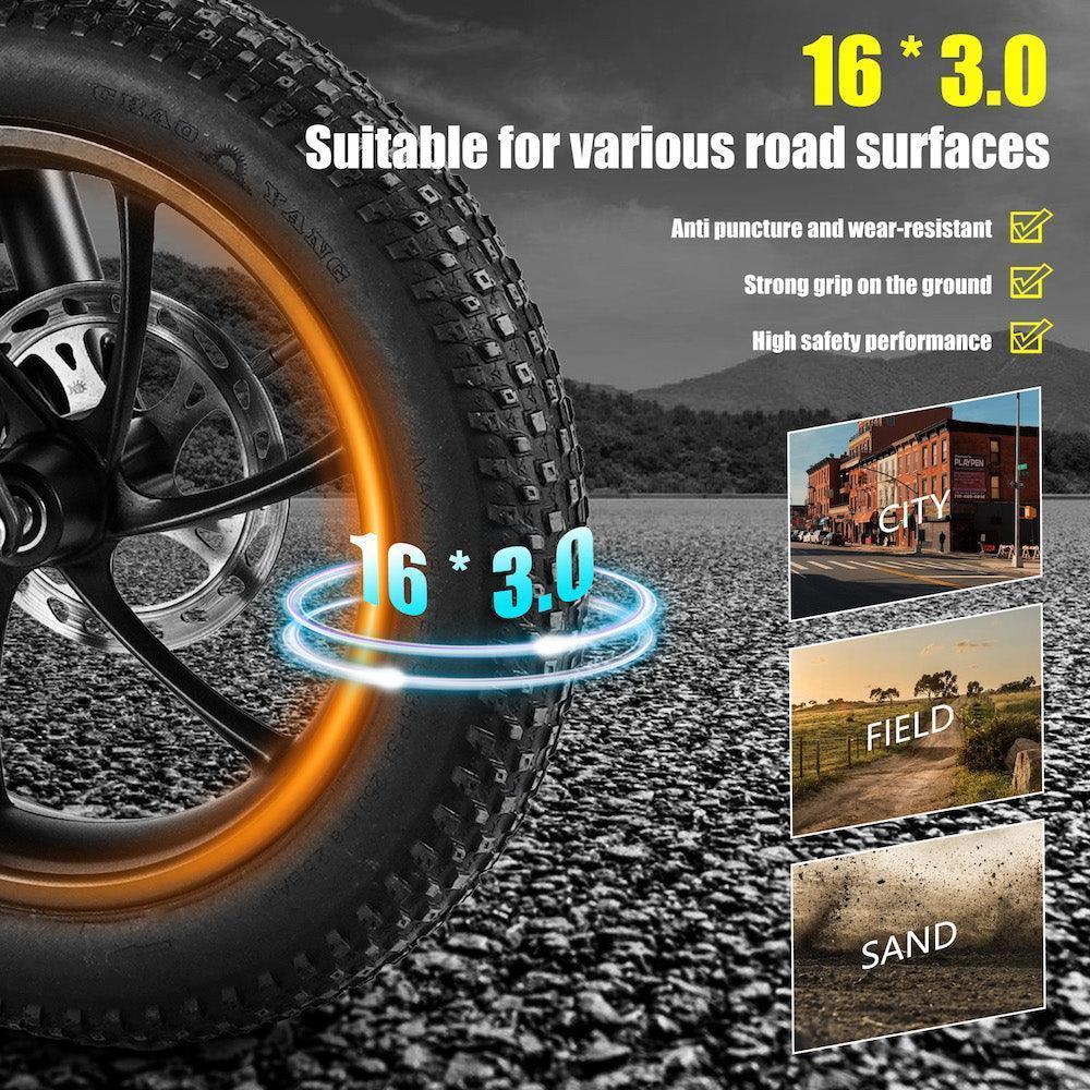 - Hjul/däck: 16″ × ca 2.1″