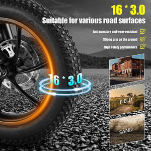 - 16″ × ca 2.1″ däck: lätt rull och tryggt grepp på asfalt och cykelbana.