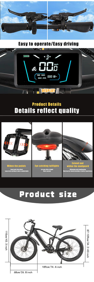 CMACEWHEEL AL26 Max ger dig dubbla 500 W motorer (totalt ~1500 W peak), ett stort 48 V / 17 Ah (≈816 Wh) batteri och kraftfull prestanda. 26×3,0″ fatdäck, hydrauliska skivbromsar och stötdämpning fram & bak gör den redo för både branta backar och tuff terräng. Fri frakt – alltid.