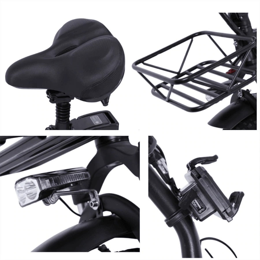 - 750 W borstlös motor (48 V): pigg start, lätt att hålla fart och klättra i backar.