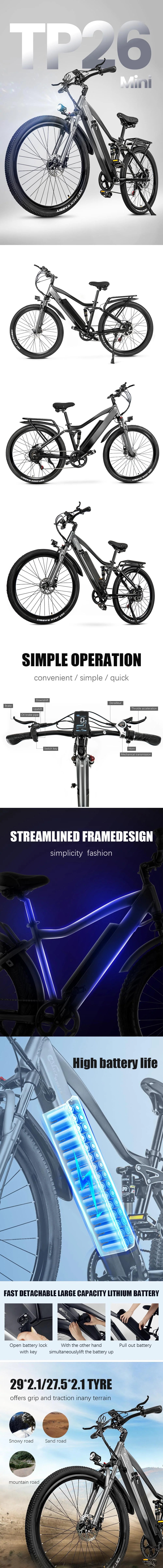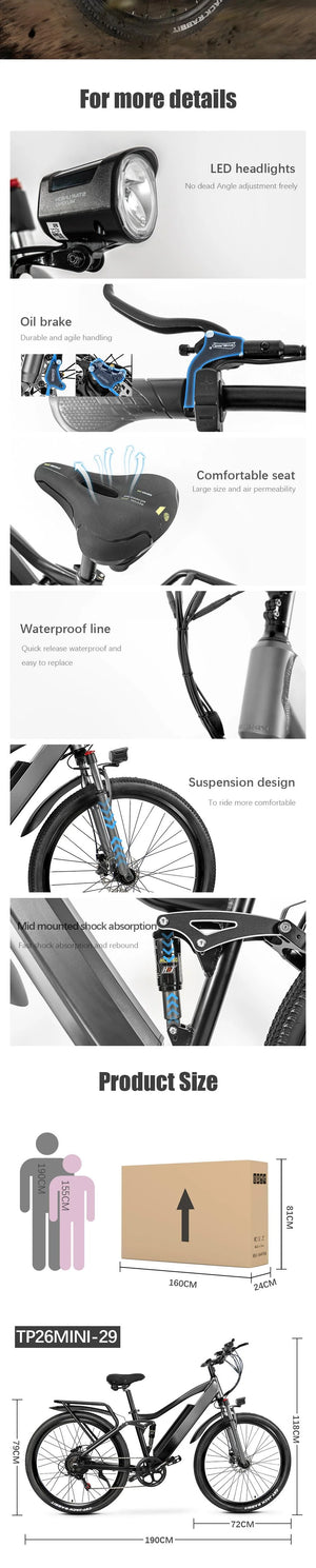 Välj TP26 Mini om du vill ha en kompakt el-fatbike som trivs i stan men även klarar grusväg, skogsstig och vinterväglag. Den kortare hjulbasen och de breda däcken ger kvick manövrering och trygg stabilitet. Kör PAS för längre räckvidd eller använd ren elassistans när du vill rulla avslappnat.