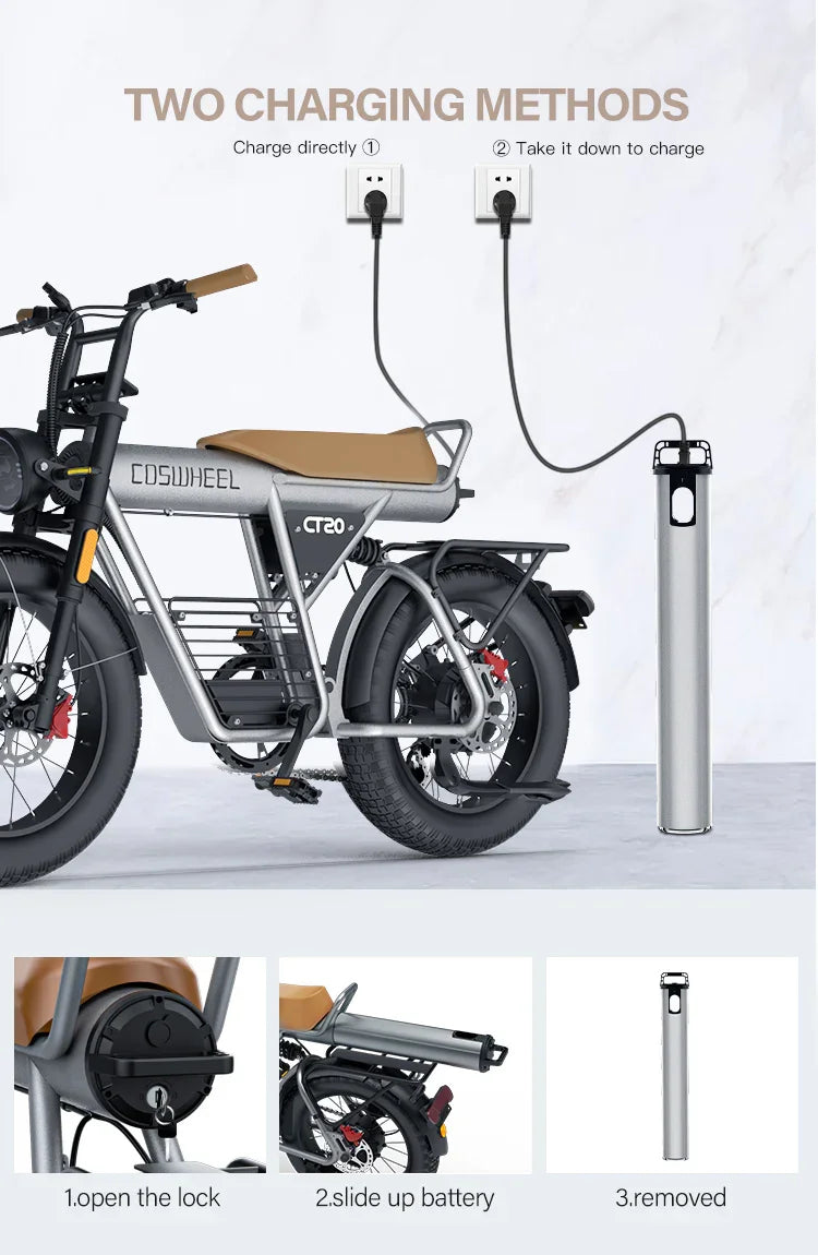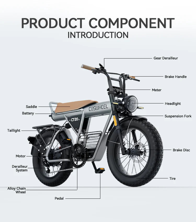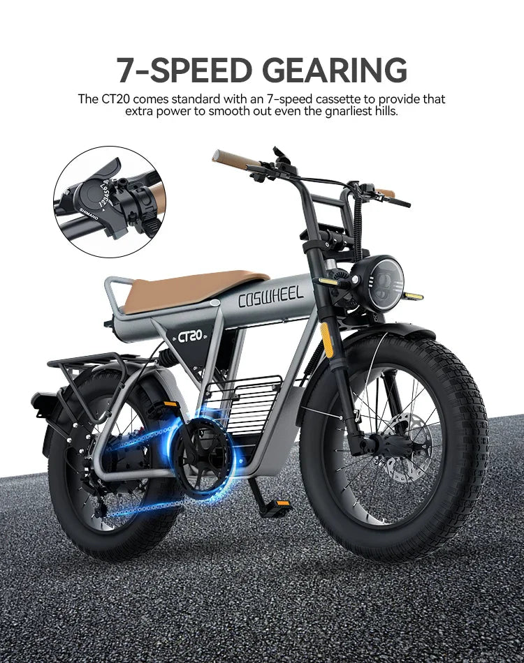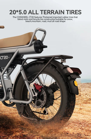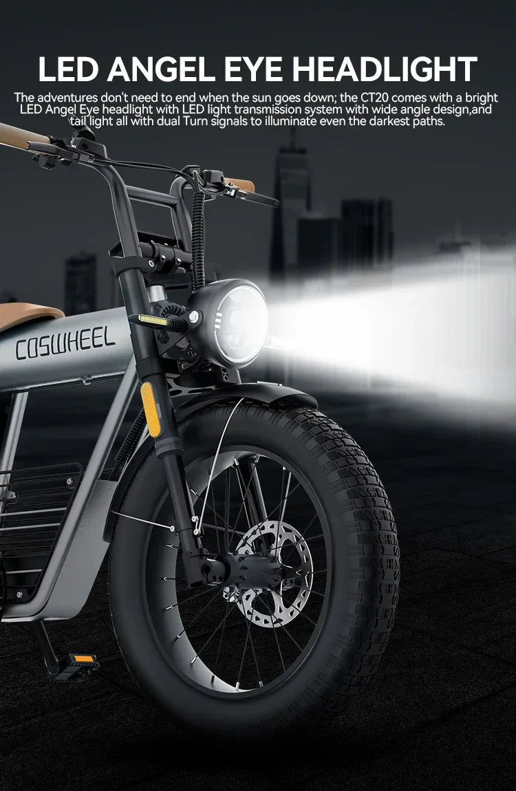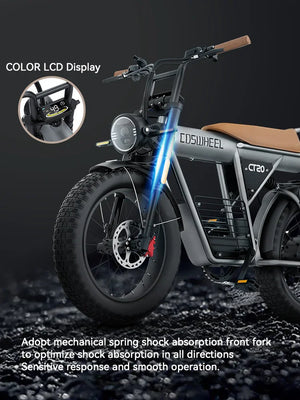 Coswheel CT20-20 är en kompakt 20-tums fatbike som kombinerar stil, kraft och smidighet. Med en borstlös motor, löstagbart batteri och breda 20×4,0″ däck får du komfort och grepp på cykelbanor, grusvägar och stadstrafik.