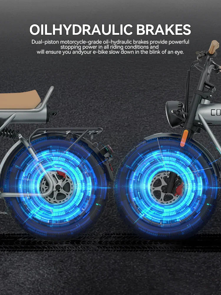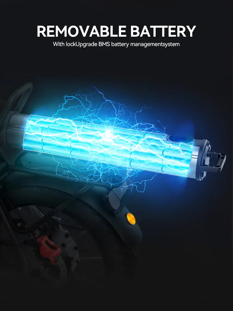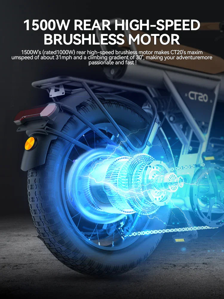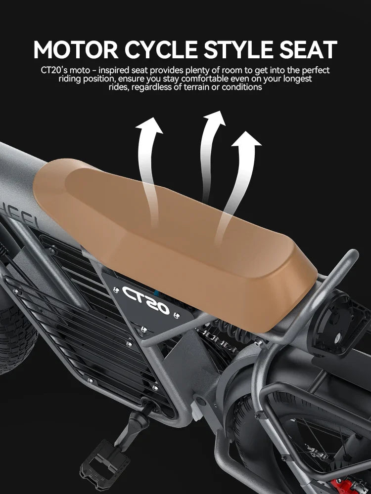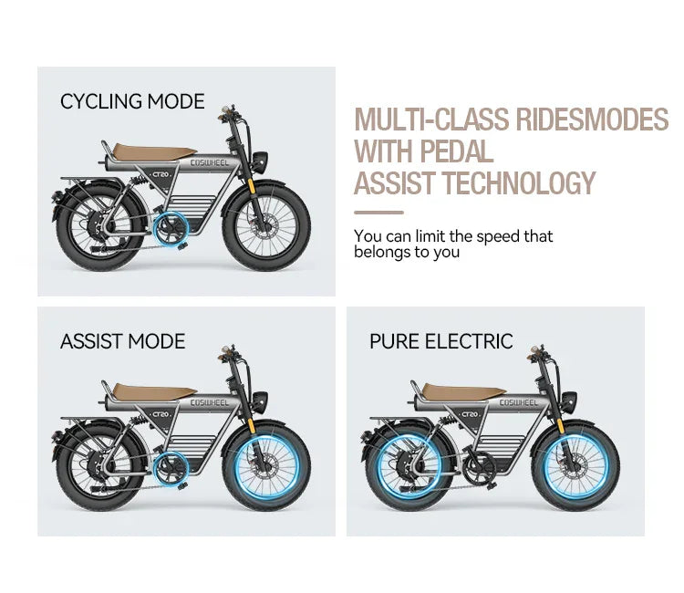 Coswheel CT20-20 är en kompakt 20-tums fatbike som kombinerar stil, kraft och smidighet. Med en borstlös motor, löstagbart batteri och breda 20×4,0″ däck får du komfort och grepp på cykelbanor, grusvägar och stadstrafik.