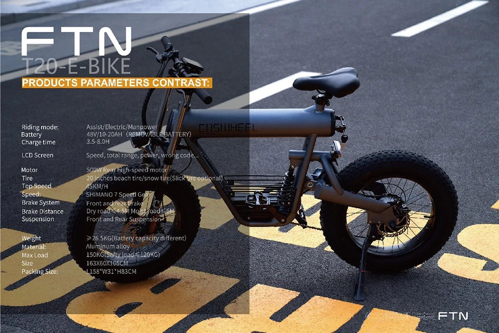 Coswheel T20 är en elektrisk fatbike byggd för vardag och fritid. Den kombinerar ett 48 V / 20 Ah litiumbatteri med en 500 W borstlös växelmotor med högt vridmoment, dämpad framgaffel och mellanfjädring i ramen. Med Shimano 7-växlar, YL-80C-B LCD-display och breda 20×4,0″ däck får du kraft, komfort och kontroll – varje dag. Fri frakt – alltid.