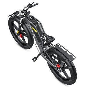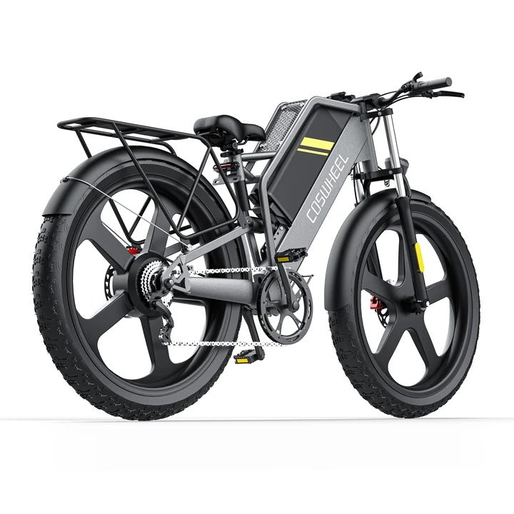 Coswheel T26 är en off-road-inriktad el-fatbike som kombinerar kraft, lång räckvidd och komfort. Den är utrustad med en 48 V borstlös baknavmotor (1000 W version med 1500 W topp-effekt) som levererar upp till 80 Nm vridmoment, ett 48 V / 25 Ah (1200 Wh) batteri, full fjädring och hydrauliska skivbromsar. De breda 26×4,0″ CHAOYANG-däcken ger stabilitet och grepp på sand, snö, grus och ojämn asfalt. Fri frakt – alltid.